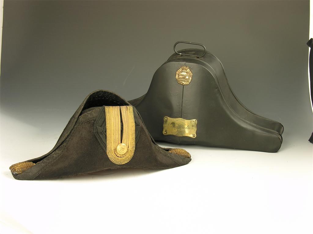 A naval bicorn hat, by Matthews & Co, Portsea, Portsmouth, size 6 7/8, 16in (40.5cm) w, in a fitted tin box with brass trade label and owner's plaque inscribed Dr H. J. Hadden, R. N. Box re-painted.