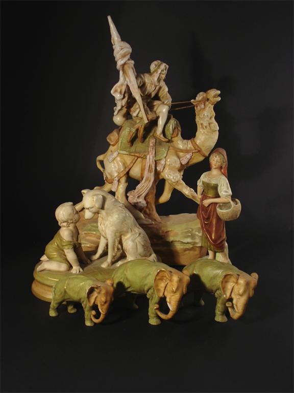 A Royal Dux figure of a boy with a retriever an Amphora figure of a man on a camel and a...