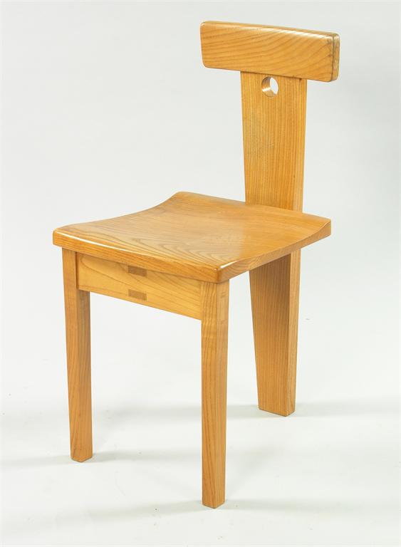 An interesting Contemporary elm chair Cotswolds style, tripod leg, the back splat with simple pierced circle decoration unmarked 78cm. high