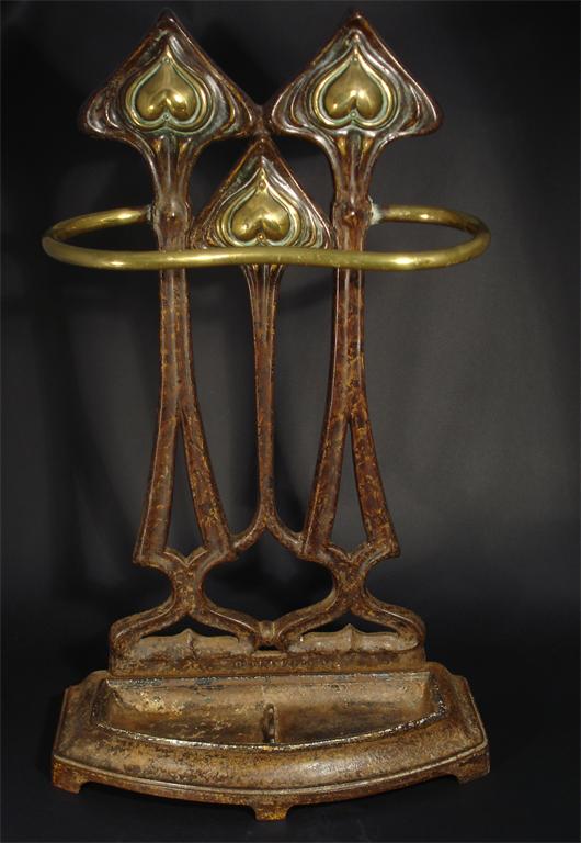 An Art Nouveau cast iron and brass umbrella stand the back pierced and cast with three Art...