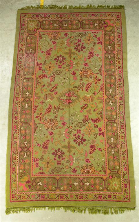 An Arts and Crafts Donegal carpet in the style of Gavin Morton green ground with stylised flower...