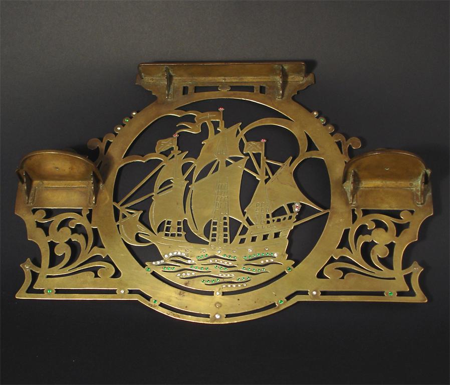A brass wall sconce, pierced form decorated with a galleon at full sail, the sea set with stones unmarked 37cm. wide