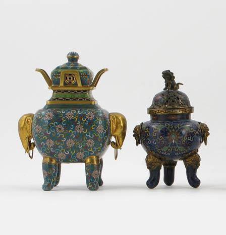 A miniature cloisonné koro and cover with gilt elephants head handles, 15cm (6in) high and another with lion finial and handles, 14cm (5.5in) high. (2)