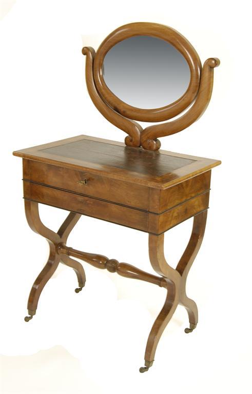 A 19th century continental walnut dressing table, with mirror back and two frieze drawers on X supports joined by a baluster stretcher, leather castors, 126cm (49.5in) high, 69cm (27.25in) wide.