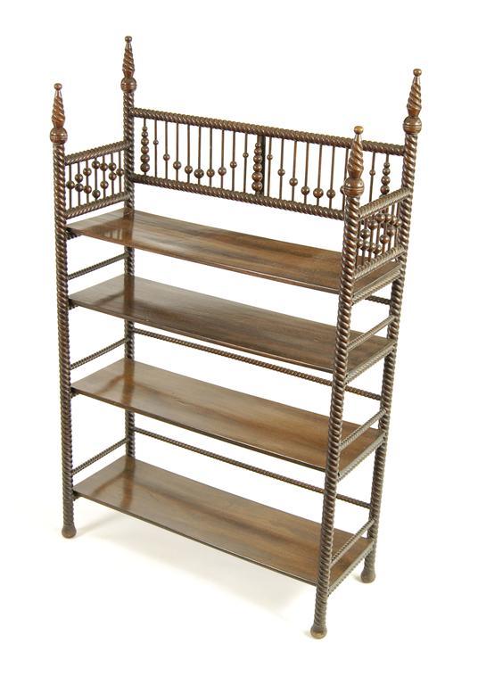 A continental mahogany open bookcase, with rope twist supports and four shelves, 108cm (42.5in) high, 67cm (26.5in) wide.
