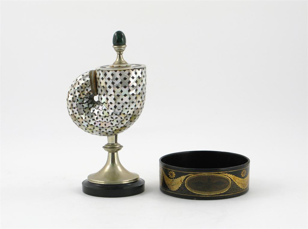 A papier maché coaster, gilt decorated with leaf swags and panels, 5.25cm (13.5in) diameter and a mother of pearl cornucopia with malachite finial and plated stem, 24.5cm (9.5in) high. (2)