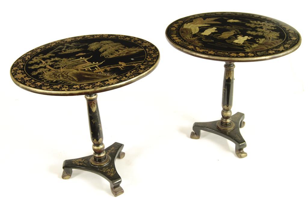 A pair of Chinese lacquer and gilt circular tilt top tables