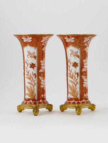 A pair of Coalport Imari pattern vases on gilt claw and ball feet