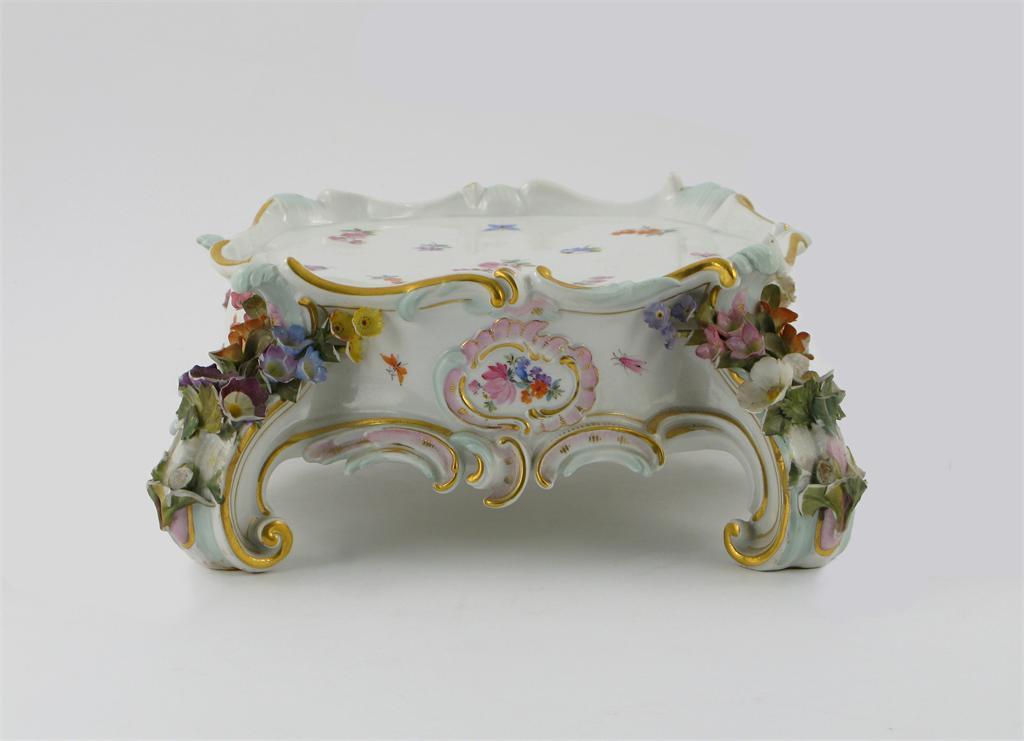 A late 19th century Meissen shaped rectangular stand decorated with floral sprays and applied...