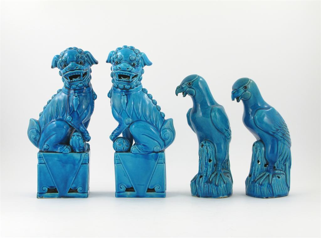 A pair of Chinese turquoise pottery Dogs of Fo, 34.5cm (14.5in) high and a similar pair of parrots, 27cm (10.5in) high. (4)