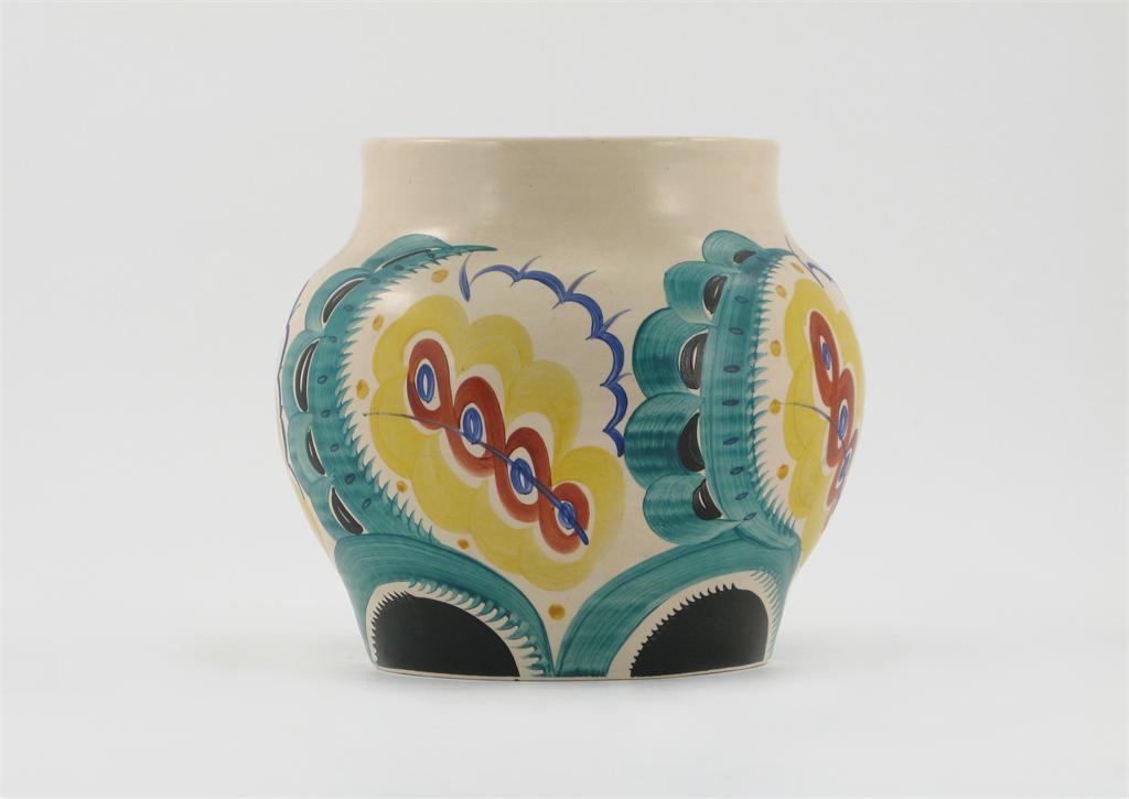 A Susie Cooper hand painted pottery vase, decorated with repeating multi coloured roundels, 15cm (6in) high.