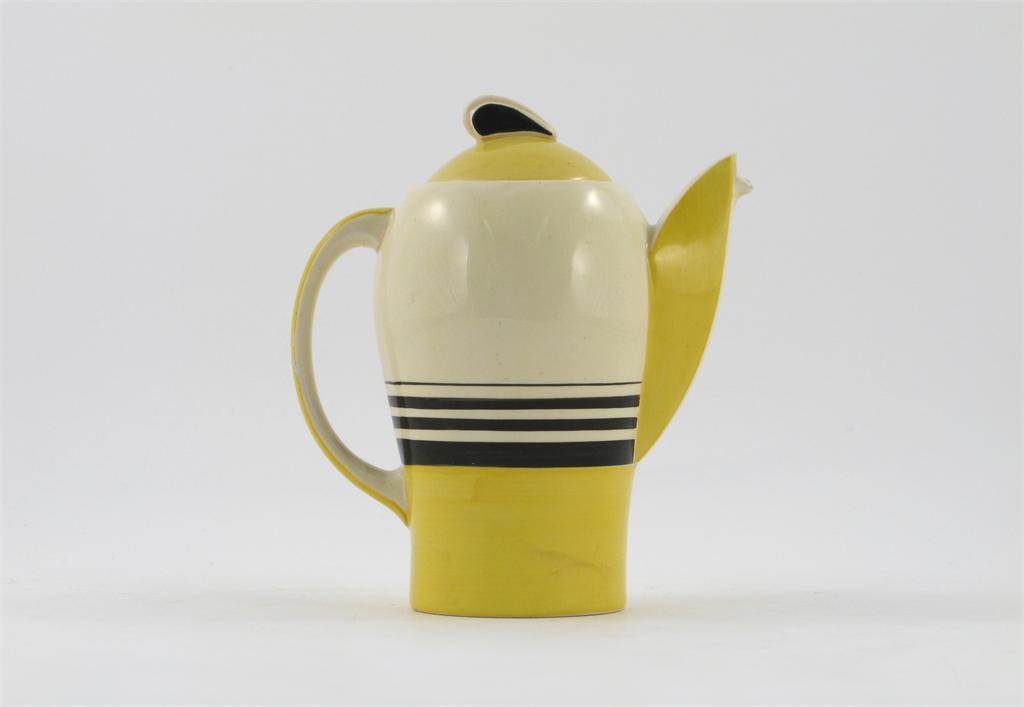 A Susie Cooper Kestrel teapot, decorated in cream, yellow and black, 19.5cm (7.75in) high.