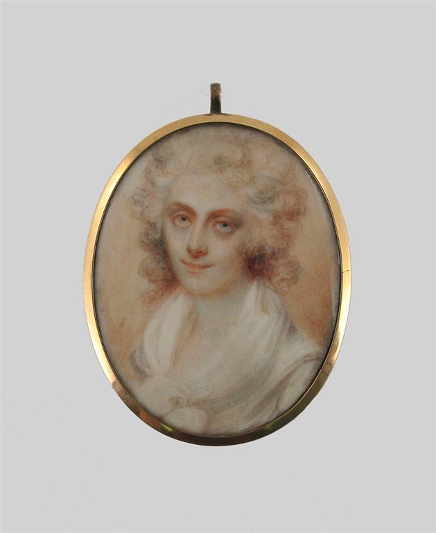 A 19th century oval portrait miniature of a lady wearing a white dress
