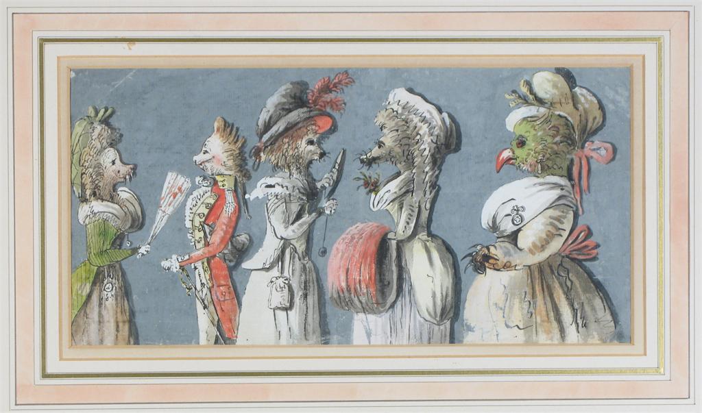 Isaac Cruikshank (c.1756-1811/16): Caricatures of Birds and Animals, pen, ink and watercolour, 14.5 x 29.5cm (5.75 x 11.5in).
