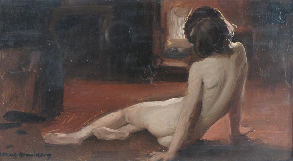 English School early 20th century: Study of a nude, signed indistinctly ** Davidson, oil on artist board, 15.25 x 29cm (9 x 11.5in).