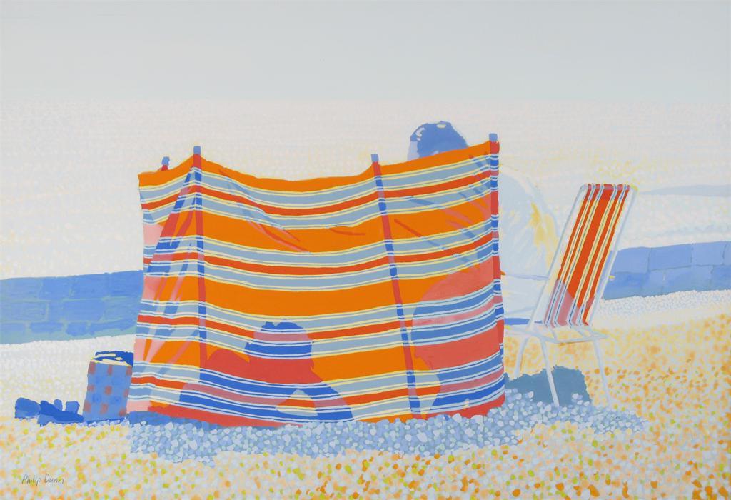‡ Philip Dunn (20th century): Beach scene with windbreak