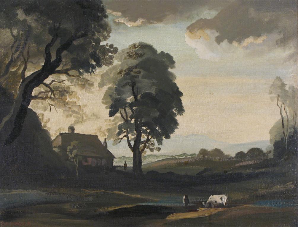 Phillip Hugh Padwick RBA, ROI, (1826 - 1958): Cattle grazing, a farmhouse nearby, signed, oil on canvas board, 45 x 60cm (17.75 x 23.5in).