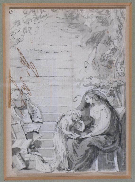 Follower of George Romney: Mother and daughter, pen, ink and grisaille wash, 11 x 7.5cm (4.5 x 3in).