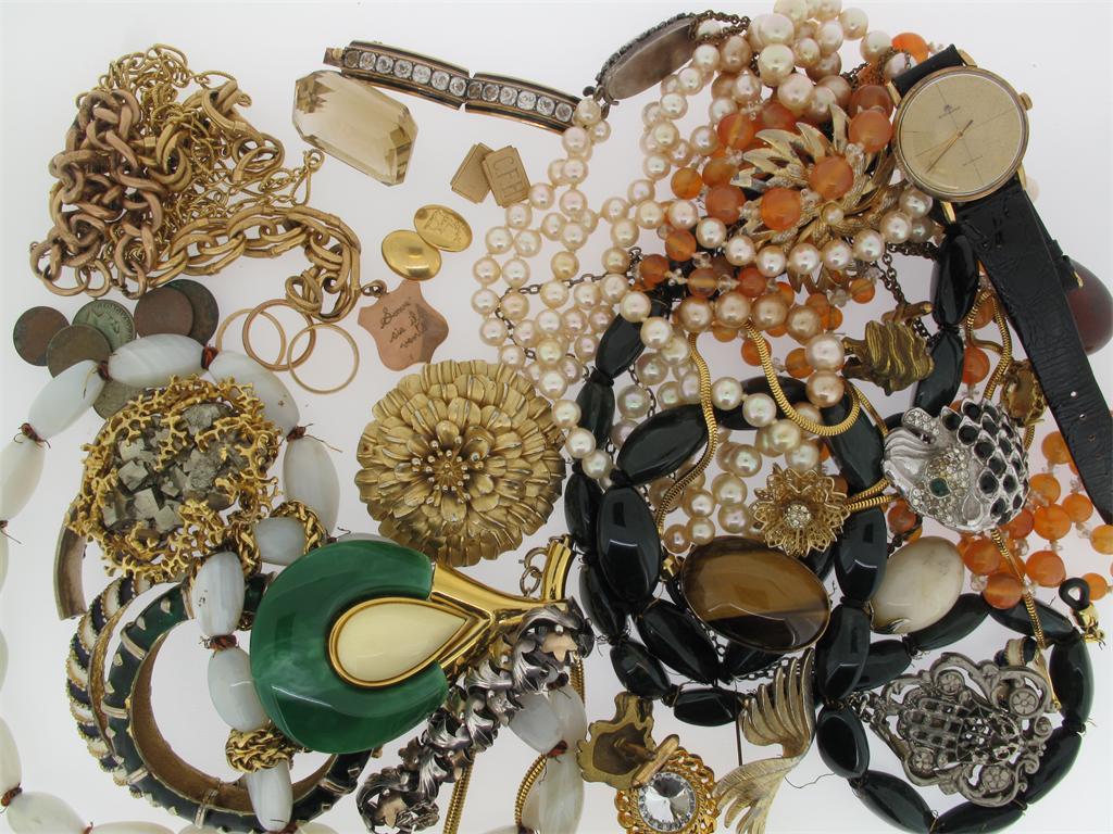A gold necklace, two damaged gold bracelets, three gold wedding rings, two pairs of gold cuff links, a gold pendant (approximately 98g total). A large emerald cut citrine, and costume jewellery.