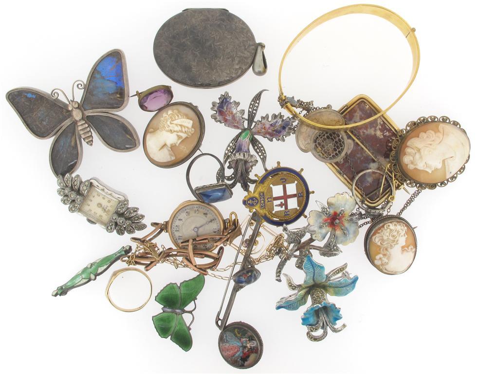 Assorted jewellery and costume jewellery including two butterfly brooches, two Edwardian pendants, a ladies gold wristwatch (damaged) and a Regency jasper brooch.