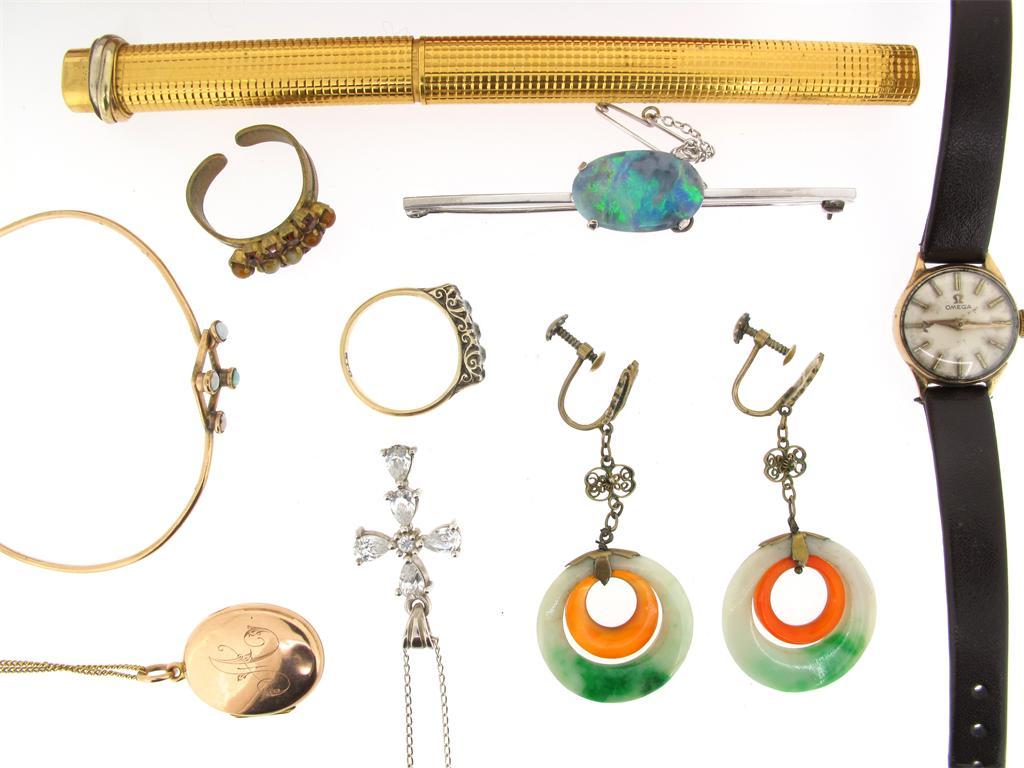 A solid black opal mounted white gold bar brooch. A cased Must-de-Cartier ball point pen. And assorted items of jewellery and costume jewellery.