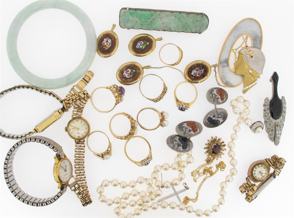 A sapphire and diamond cluster ring. Another sapphire and diamond cluster ring, an opal set gold ring, a diamond set white gold cross pendant, four wristwatches, a bangle, a large gold mounted brooch designed as a ladies head by a window, and various items of jewellery etc.