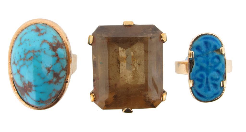 A gold ring mounted with a large rectangular shaped smokey quartz. A gold ring mounted with a large turquoise cabochon. A gold ring mounted with a faience section.
