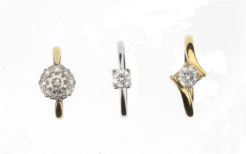 A diamond solitaire ring set in white gold. Size M. A diamond cluster ring set in gold. Size K 1/2. And a diamond solitaire ring set in gold. Size N.