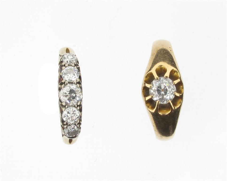 A diamond solitaire ring. Set in gold. Size N 1/2. And a diamond five stone ring