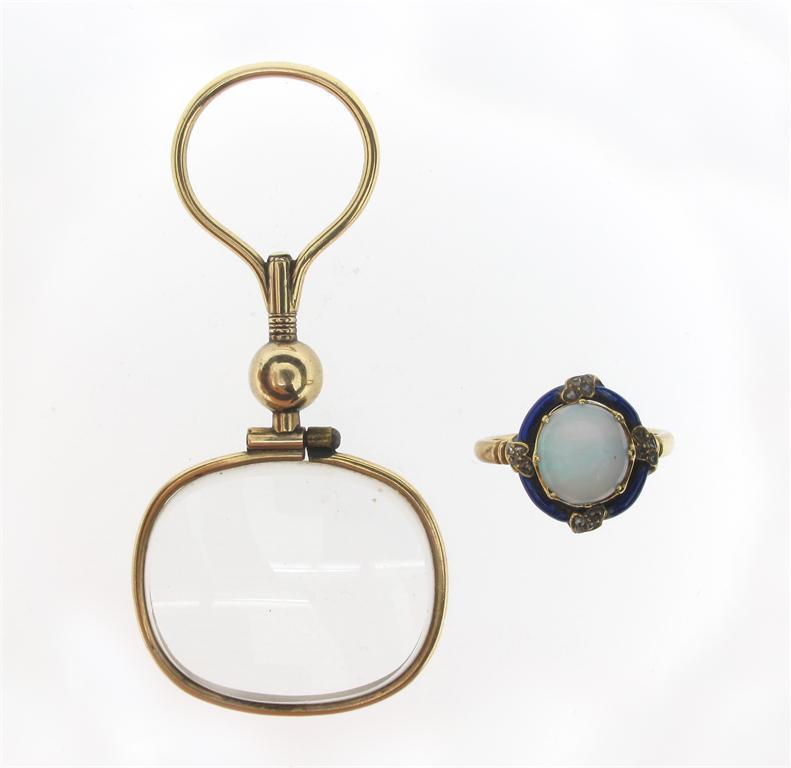 A gold cased quizzing glass, and an opal ring with blue enamel and rose cut diamond border in gold. Size N 1/2.