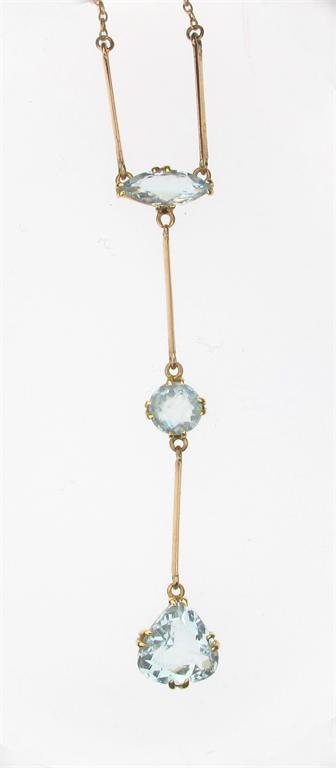 An Edwardian aquamarine pendant. Suspending a marquise shaped, a circular cut and a triangular cut aquamarine on a fine link gold neck chain.