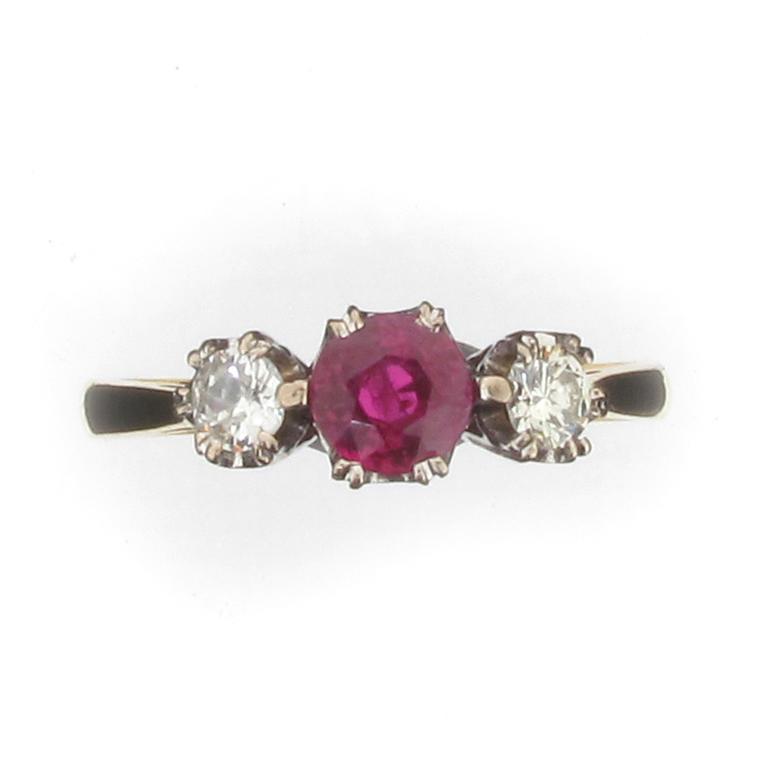 A ruby and diamond three stone ring. Set in 18ct yellow gold. Size P.
