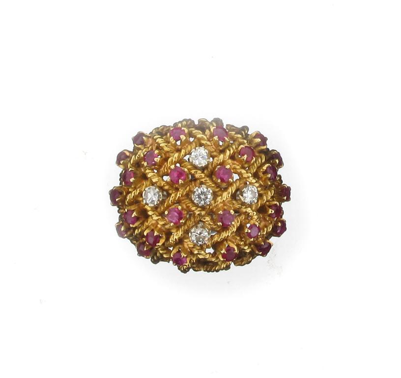 A gold cluster ring set with small diamonds and rubies. Approximately 8g.