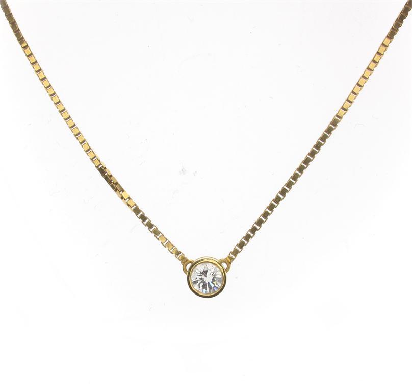 A diamond pendant. The brilliant cut diamond weighs approximately 0.50 carats. On a gold box link neck chain.