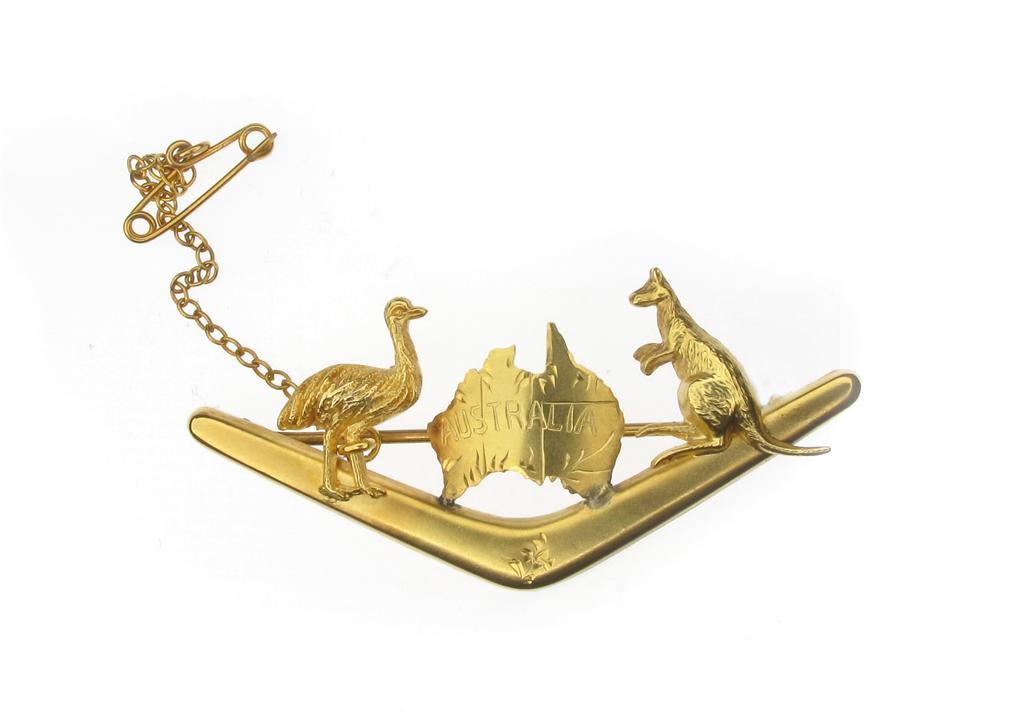 Of Australian interest. The gold brooch centered with a map of Australia on a boomerang with an emu and kangeroo. 5cm wide. Case.