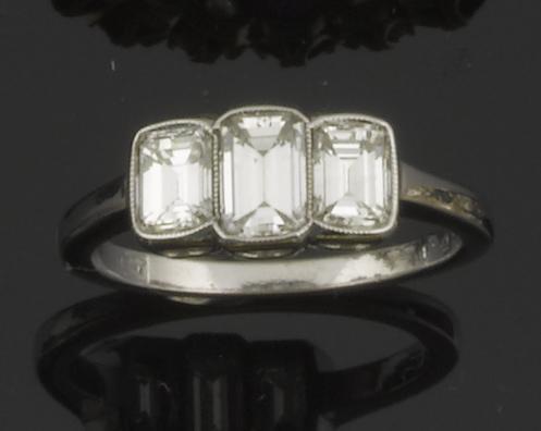 A diamond three stone ring. The three emerald cut diamonds weigh approximately 1.45 carats and...