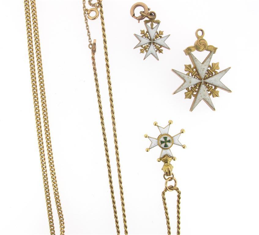 A fine link 18ct gold long guard chain. 100cm long. Approximately 15g. With three maltese cross gold pendants with white enamel decoration.