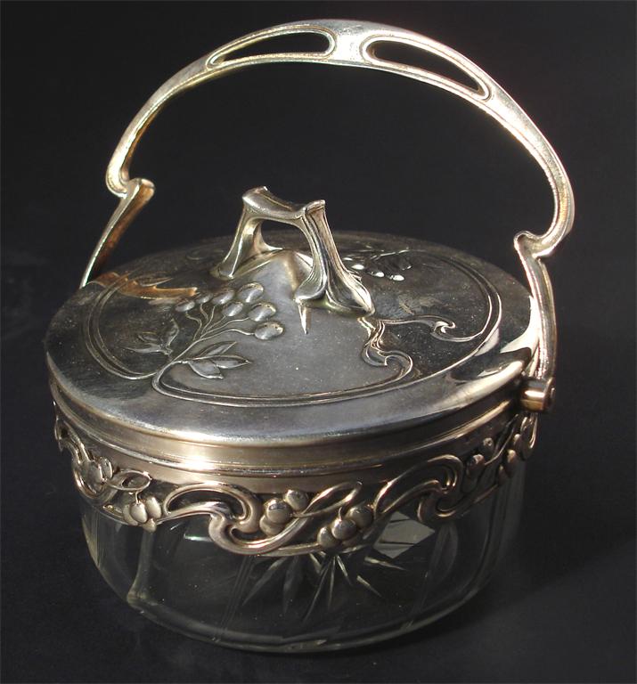A WMF Art Nouveau electroplate and glass biscuit jar and cover shallow cylindrical form with...