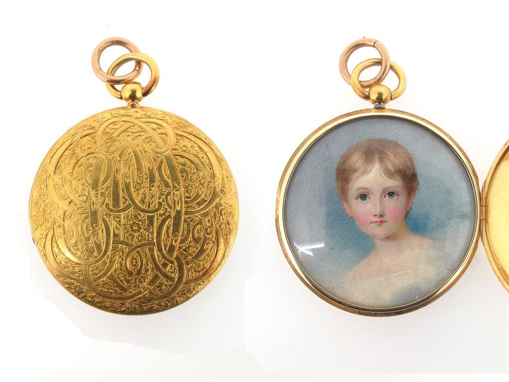 A 19th Century circular gold locket. Containing a miniature portrait of a young girl. Profusely engraved with mourning scene to one side and elaborate cipher amongst foliage to the other. 5cm wide.
