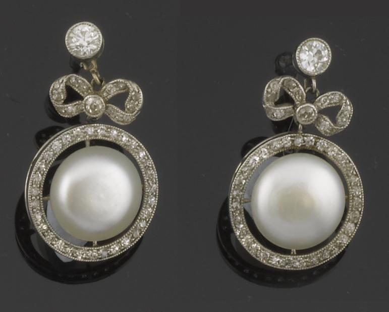 A pair of Edwardian pearl and diamond drop earrings. The button pearls measure 9.4mm and 9.3mm diameter set within a surround of small cushion shaped diamonds and suspend from diamond bows. With pearl report number 0911/17 stating that both are natural pearls. With case by Tessier.