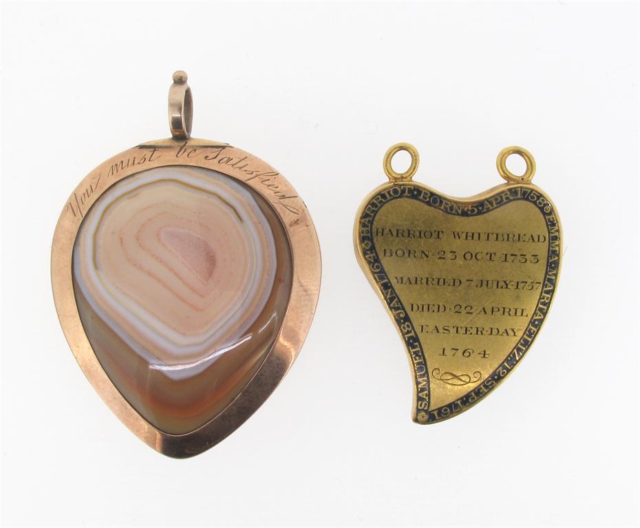 A George III pear shaped locket pendant. Engraved 'you must be satisfied' containing banded agate to one side and plaited hair to the other. 5cm high. And an unusual gold witches heart shaped mourning pendant. The front section containing hair (missing glass) . With enamel mourning assorted inscriptions to the reverse. 3.5cm high.