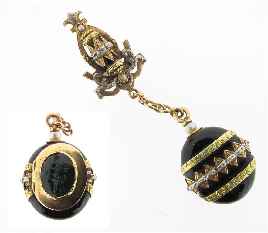 A 19th Century black enamel fob pendant with three colour gold decoration