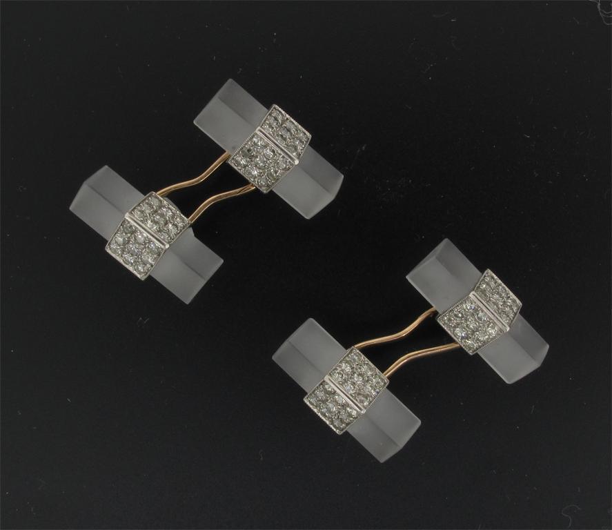 A pair of frosted rock crystal and diamond cuff links of triangular bar form and mounted in...