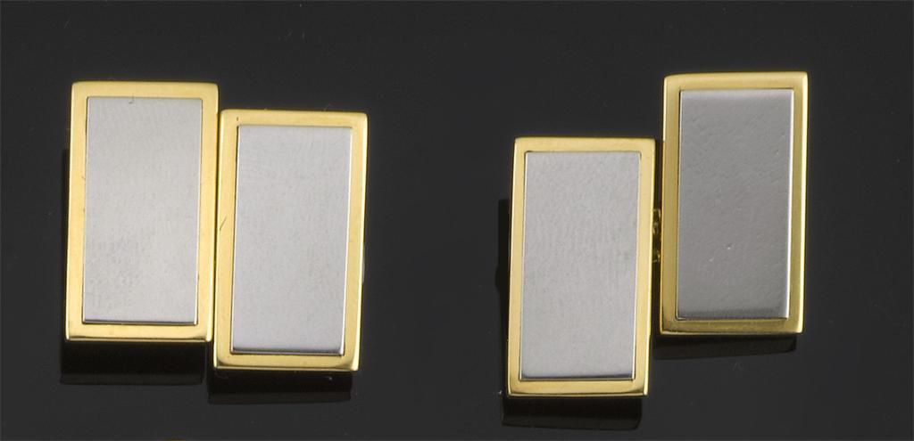 A pair of gold and steel rectangular cuff links. 2cm wide.
