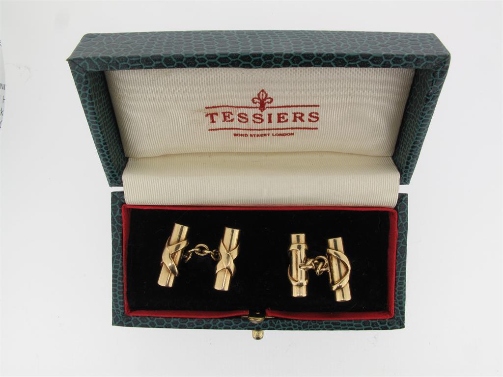 A pair of gold tied baton form cuff links. With Tessier case.