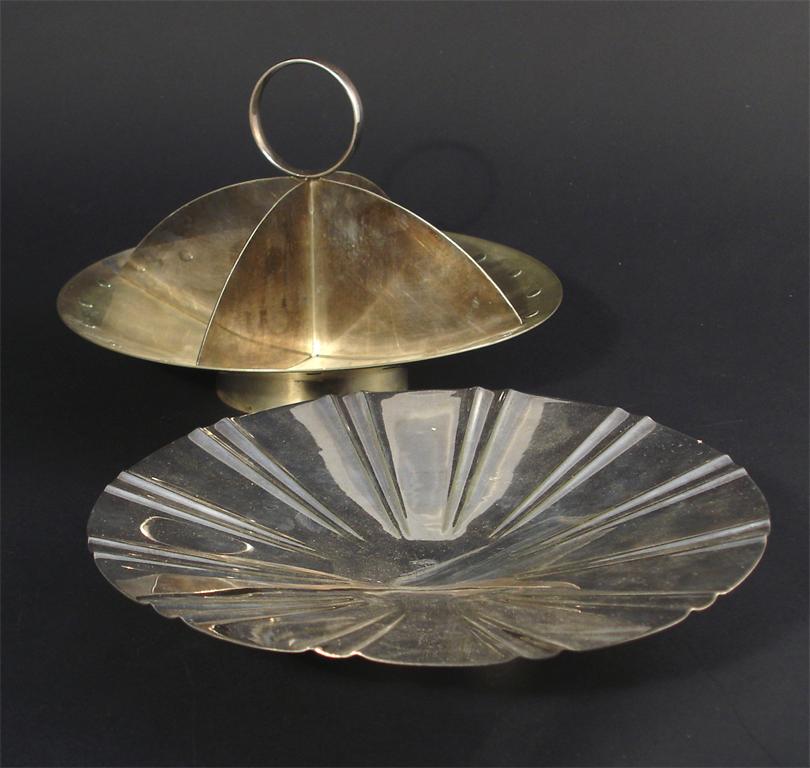 An English Art Deco electroplated pedestal dish, fluted flaring form on collar foot, and a Continental electroplated four compartment dish various marks bowl 23cm. diam.