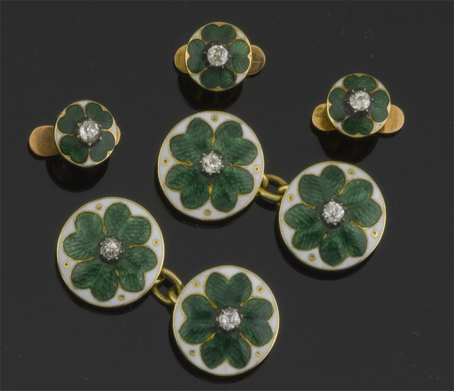 A pair of cuff links with three matching dress studs. All set with a diamond on enamel ground designed as shamrocks. 18ct gold. With a fitted cases.