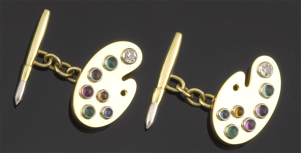 A pair of gold stylized artists pallet cuff links. Each pallet set with cabochon gem stones and a...