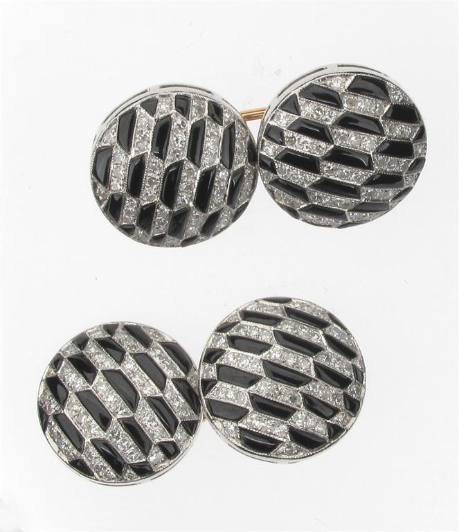 A pair of diamond and black onyx cuff links. Pave set with small diamonds and boat shaped sections of black onyx in white gold. 1.7cm wide.