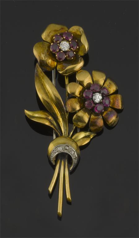 A gold flower head brooch. With two clusters centred with a circular cut diamond within ruby surrounds with a further crescent of graduated diamonds. Circa 1940. 6.5cm high, 19g.